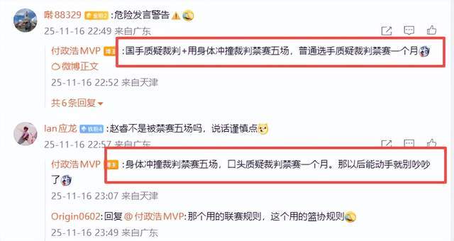 既然事情出了,那就只能面对了。不过,对于篮协开出这样的罚单,外界颇有微词,尤其是著名记者付政浩老师,公开表达了对这一处罚结果的不认可,觉得篮协处罚太重了。他在与球迷互动时,就明确表示:“国手质疑裁判+用身体冲撞裁判禁赛五场,普通选手质疑裁判禁赛一个月”。