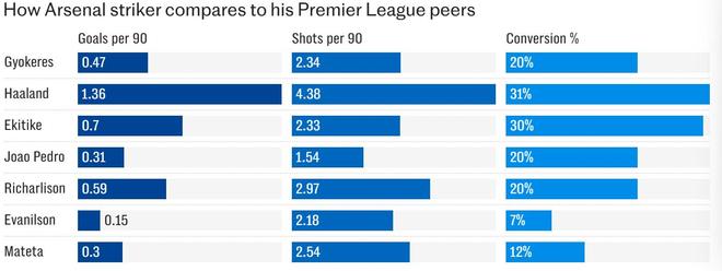 至于他的临门一脚,他在英超20%的射门转化率与里沙利松和若昂-佩德罗等人相当,但落后于利物浦的埃基蒂克(30%)、曼城的哈兰德(31%)和纽卡斯尔联的沃尔特马德(43%)。